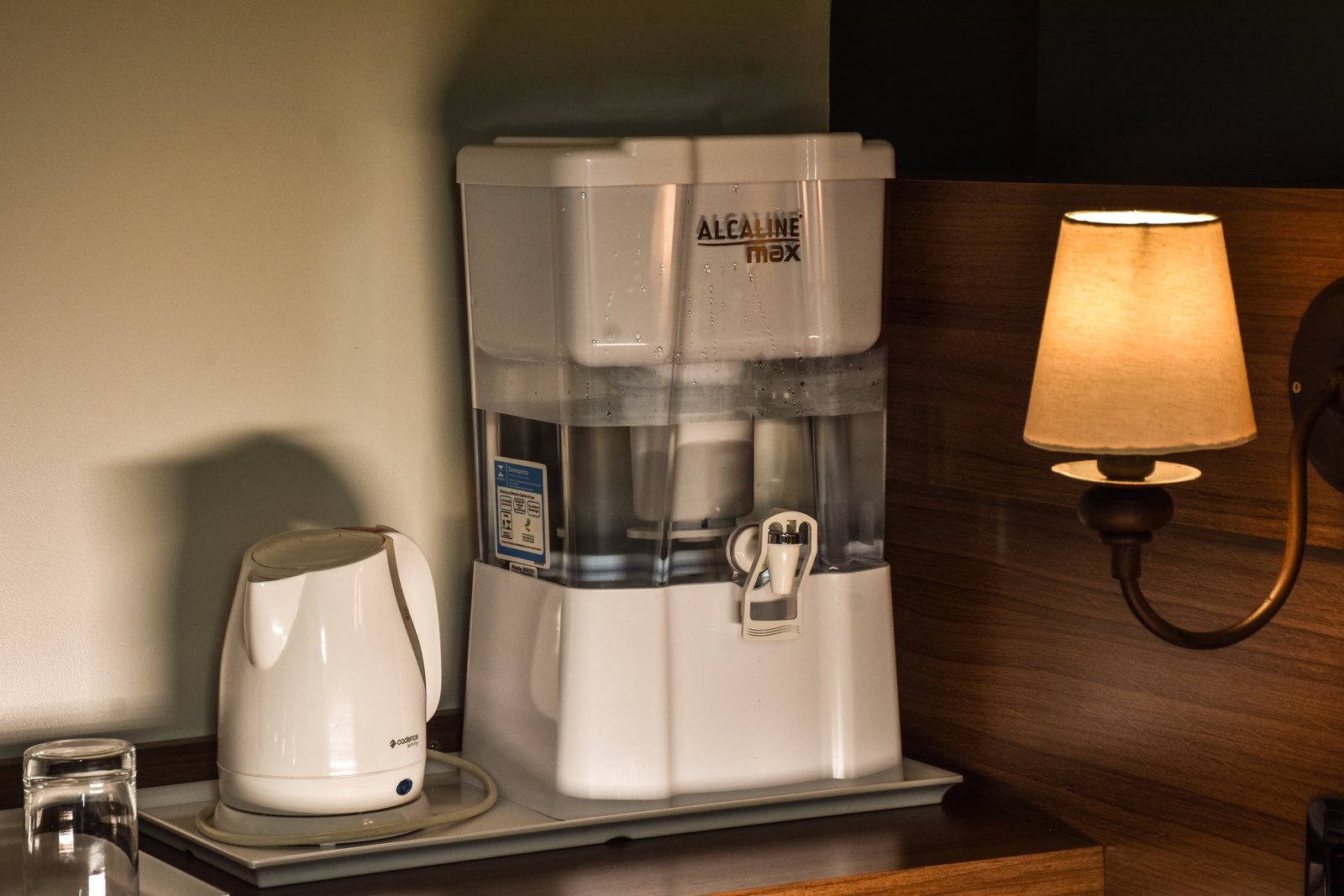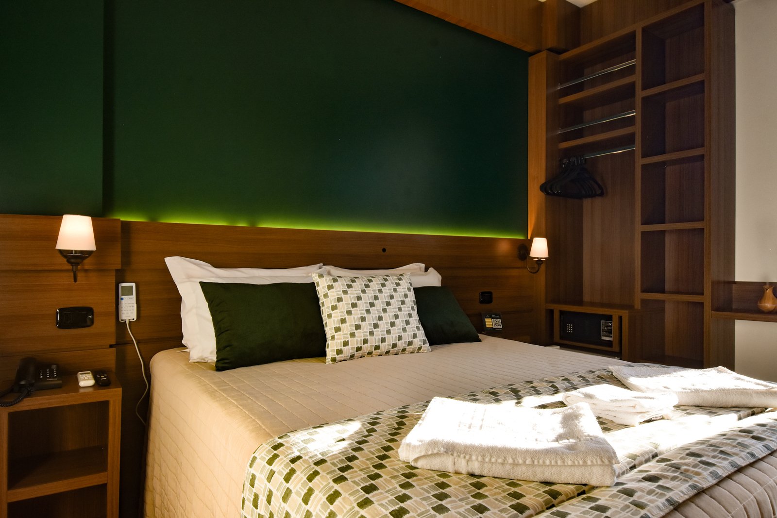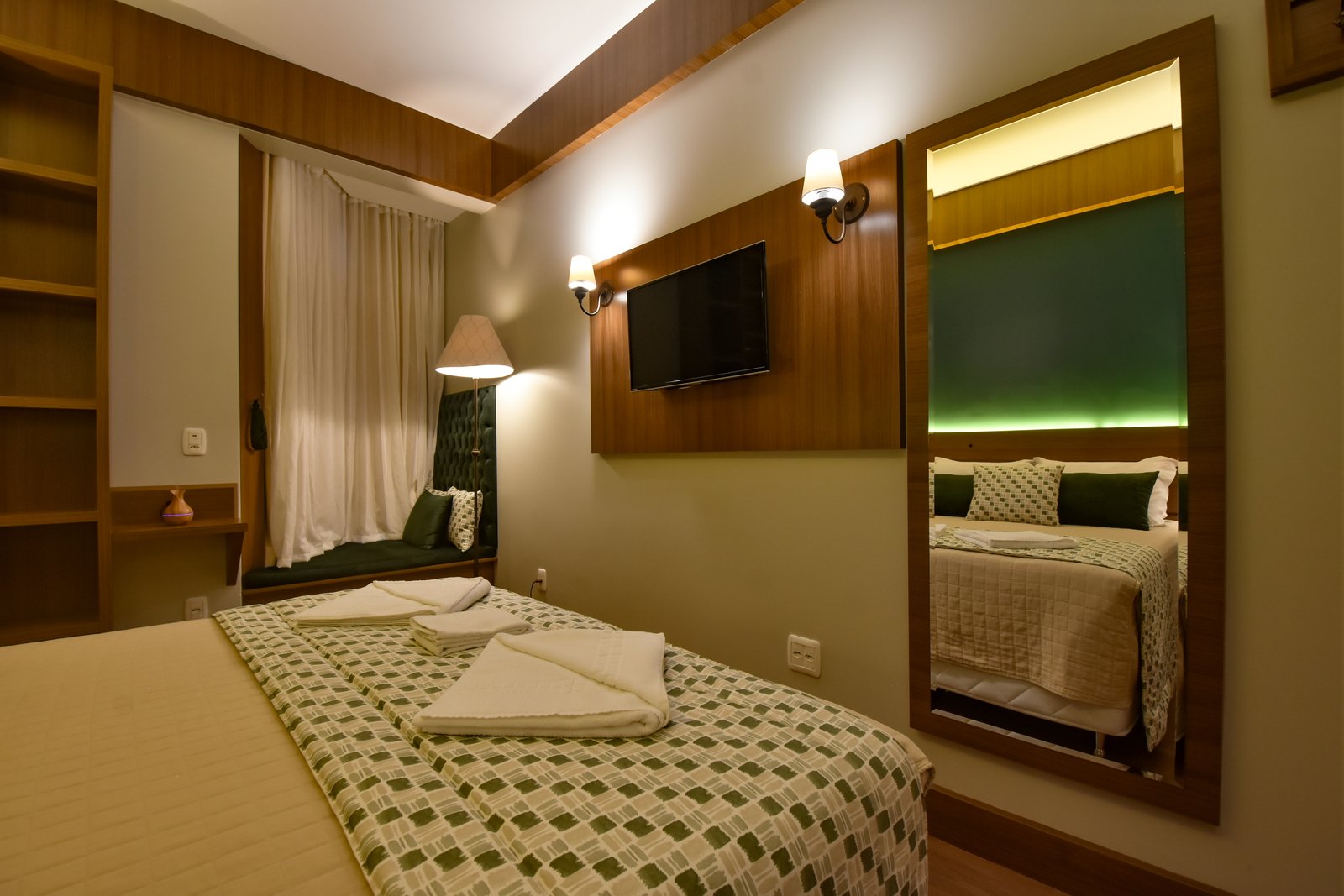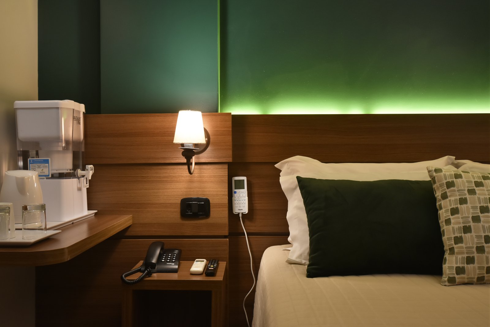 A Suíte Bem-Estar oferece um colchão terapêutico com magnetos, Fir Power, massagem, íons de prata e camada biopower, que promove sono profundo, alívio de dores e equilíbrio energético, além de travesseiros especiais que relaxam a cervical e potencializam a qualidade do descanso. Conta ainda com purificador de água alcalina, garantindo hidratação leve, saudável e antioxidante, e uma estrutura completa com cama de casal, ar-condicionado, frigobar, TV, cofre, Wi-Fi e roupas de cama e banho de qualidade.